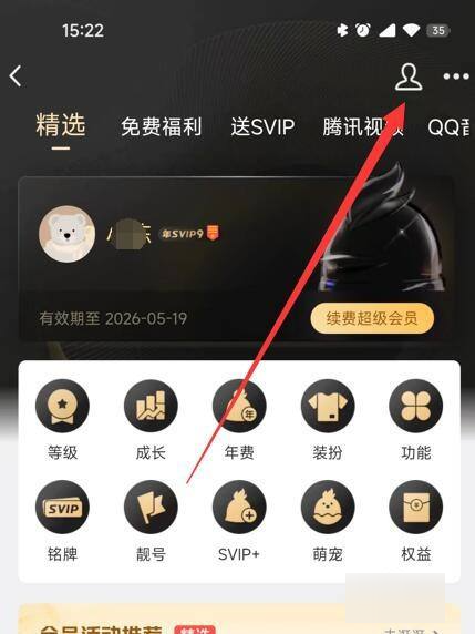 3. 在打开的会员页面,点击页面右上角的人像图标。