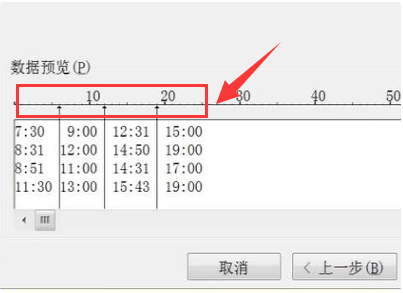 4、在文本分列向导中,适当调整列表的位置,使得每一个时间点都分隔开,接着点“下一步”按钮。