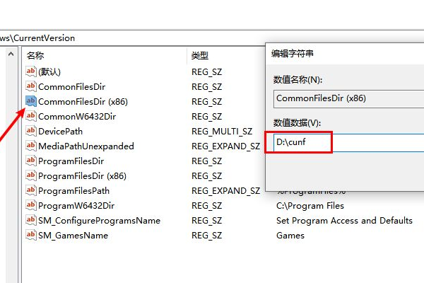 5、在右侧窗口内找到并双击CommonFilesDir (x86)文件,随后打开窗口之后,在数值数据中输入D盘存放路径。