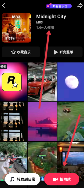 3、在这个界面就能够查看到他用的是哪首歌了。想要拍同款视频的话,点击右下角的【拍同款】即可。