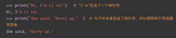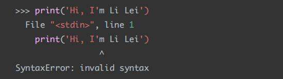Python解释器提示我们出错了。因为Python解释器会把挨着的单引号匹配起来,所以它会认为"'Hi, I'"是一个字符串,后面的"m Li Lei"Python解释器则无法解释。