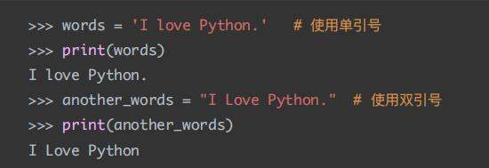 字符串可以被成对的单引号(single quote)或双引号(double quotes)包围起来,这两者的作用是一样的: