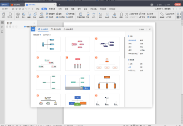 第一:打开WPS在菜单栏插入,下方的关系图,流程图,思维导图,或者组织结构图,
