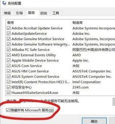 3、下方勾选隐藏所有Microfsoft服务,那么留下来的都是第三方服务了。