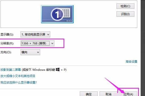 3、在屏幕分辨率哪里的滚动条“向左或向右移动”移动到你觉适合为止。在点击“应用”查看效果,