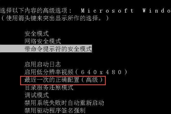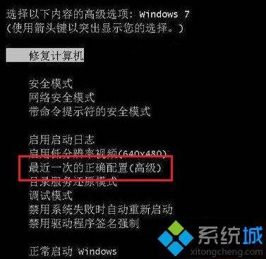 1、重启后按F8或其他按键打开高级启动选项,选择进入“最后一次的正确配置”;
