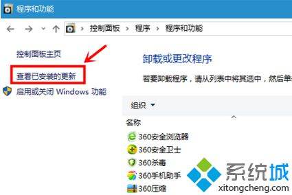 3、然后打开控制面板——程序和功能,点击“查看已安装的更新”;