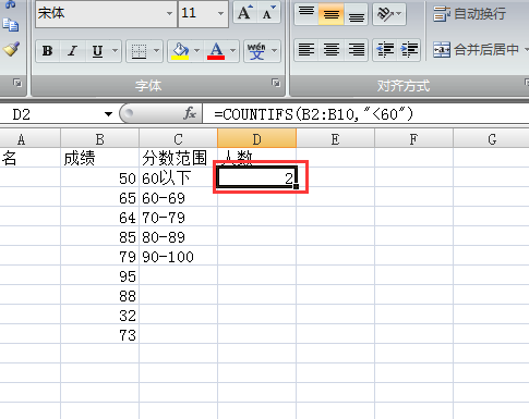 二、效果如下图,这时即可在D2单元格中统计出所有低于60分成绩的人数。