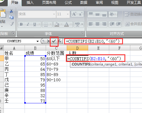 三、要在D3中统计“60分—69分”的人数,输入公式“=COUNTIFS(B2:B10,">=60",B2:B10,"<=69")”即可统计出来。