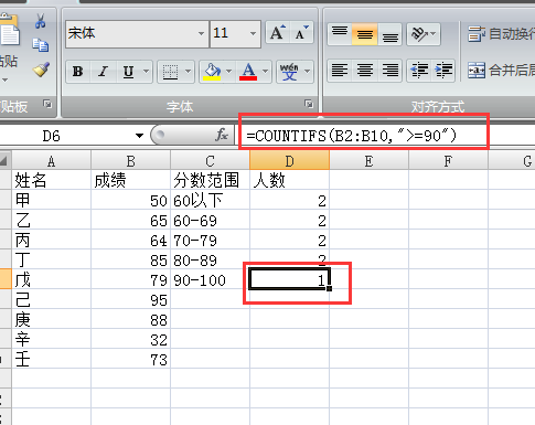 六、最后是在D6单元格统计“大于等于90分”使用公式“=COUNTIFS(B2:B10,">=90")”。