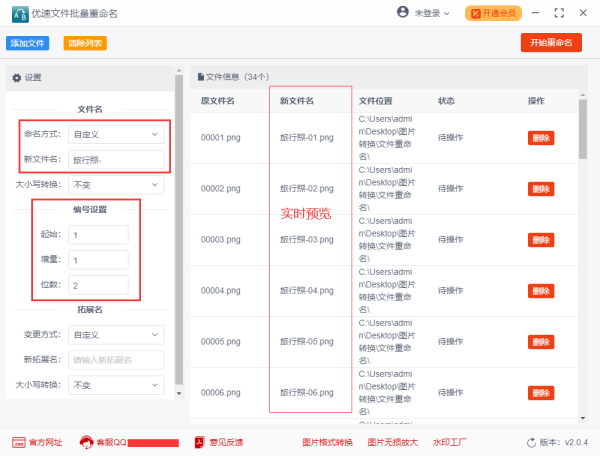 步骤3,设置好了之后可以在右边预览到新的图片名称,看是否符合自己的要求,如果没问题就可以点击【开始重命名】按钮,启动程序了。