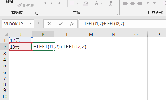 2、输入公式=LEFT(J1,2)+LEFT(J2,2),因为数字在文字前面,所以用Left公式把数字提取出来,2是代表有两位数字。