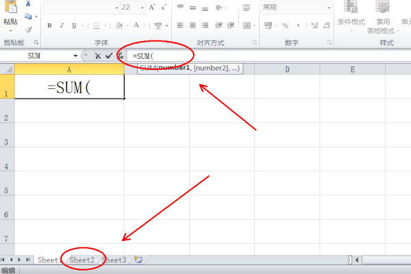 1、打开需要操作的EXCEL文档,在需要得到求和结果的单元格函数编辑框中输入求和公式=SUM(,然后点击需要求和的另一个工作表标签。