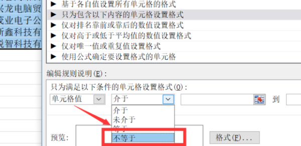 3、在弹出的对话框中选,在“选择规则类型”下选择“只为包含以下内容的单元格设置格式”在“编辑规则说明”中“介于”的下拉列表中选择“不等于”。在数据选择单元格中输入作为对比数据的首个单元格名称,如图所示为“=a1”。