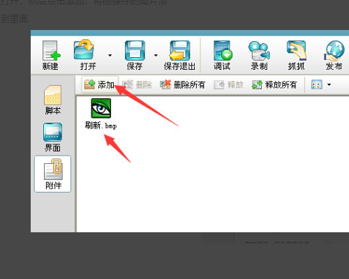 5、回到按键精灵脚本,在左上角找到附件,点击打开,然后点击添加,将刚保存的图片添加到里面。