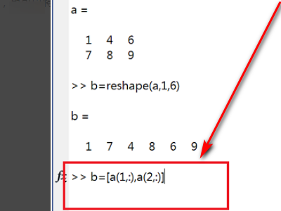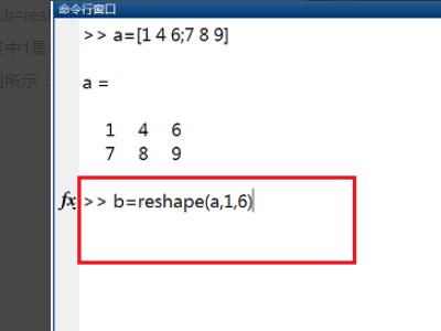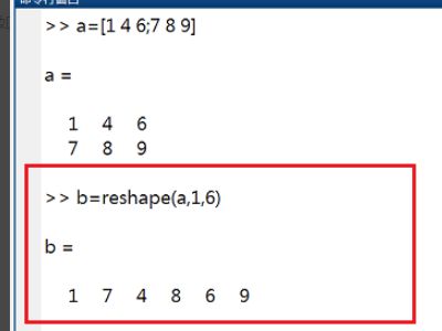 2、第二步输入b=reshape(a,1,6),将a矩阵变成行向量,其中1是1行,6是a矩阵的元素个数。