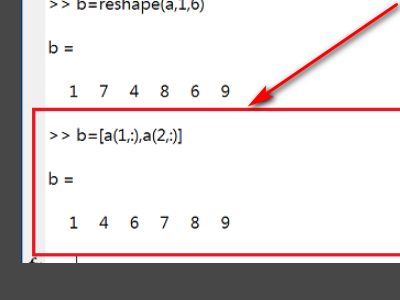 4、输入b=[a(1,:),a(2,:)],通过矩阵裁剪的方式,也可以将矩阵变成行向量。
