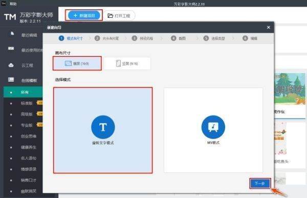 一、点击“新建项目”按钮,选择视频尺寸,如果是在手机播放,选竖屏;选“旋转文字模式”,这个是经典的模式。点击“下一步”即可。
