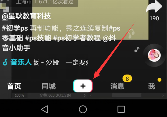 3、保存好视频后,回到抖音首页,点击页面下方的+符号。