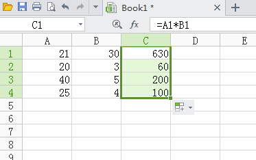 4、松开鼠标,A列与B列的求积即可计算出来,在WPS Excel中与Office Excel中是同样的操