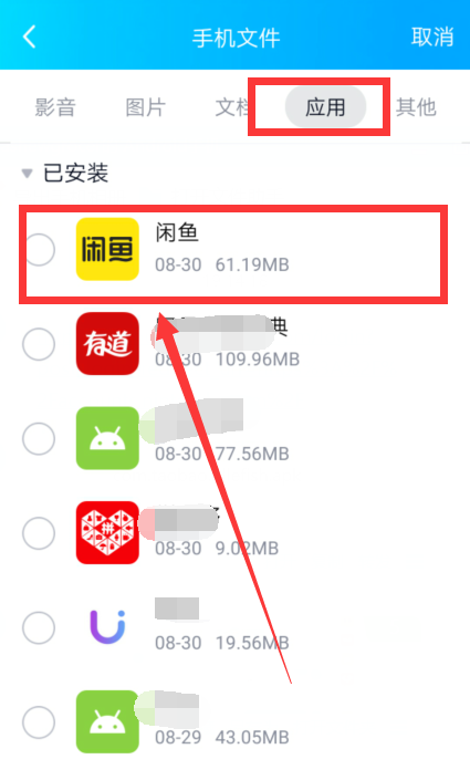 4,在选择手机文件的页面中,先点击上方的“应用”,然后选择要打包成apk的应用,选中然后发送。