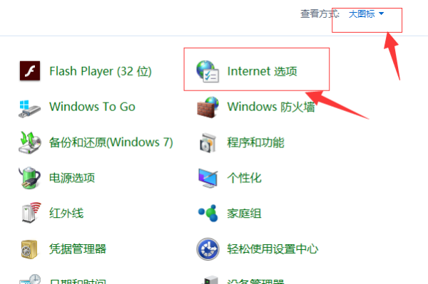 2、在控制面板以大图标方式查看单击“Internet选项”;