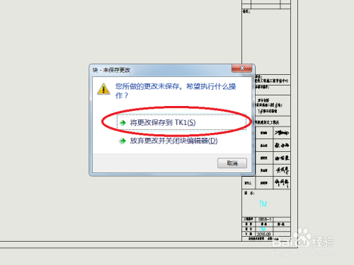 弹出“块-未保存更改”,想要保存图框中你已修改的内容,就要点击“将更改保存到TK1(S)”,这样你图框的内容就修改完毕了。