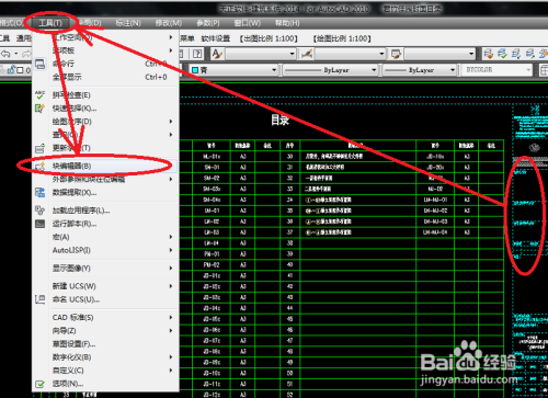 先单击选中图框,点击菜单栏中的“工具”,弹出下拉菜单,在下拉找到“块编辑器”,如下图所示: