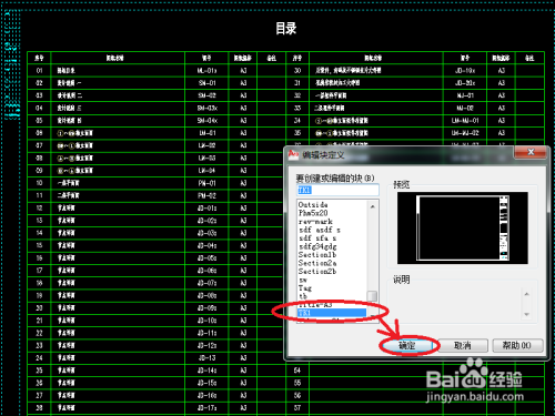 点击“块编辑器”,弹出“编辑块定义”对话框,在对话框中的“要创建或编辑的块”下方有一个蓝色已选中的块名称“TK1”,“TK1”是选中的图框的名称,然后点击对话框下方的“确定”,如图所示:
