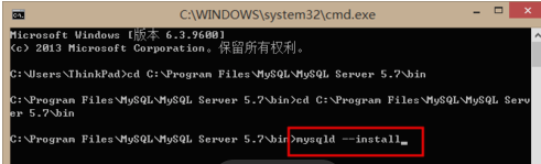 5、接下来在控制台以命令行输入:mysqld --install,进行安装服务操作。
