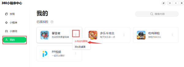点击侧边栏最左下角的这个圈圈,然后在360小程序中心,我的已添加这里删除