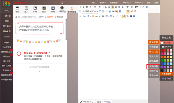 135编辑器编辑好文章之后预览不需要发到自己个人微信里这么麻烦,可以直接点击右侧的手机预览就能模拟手机页面查看效果了哦!
