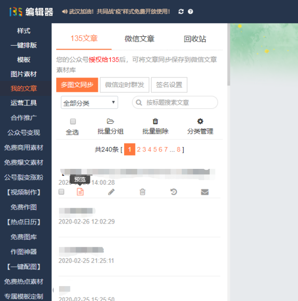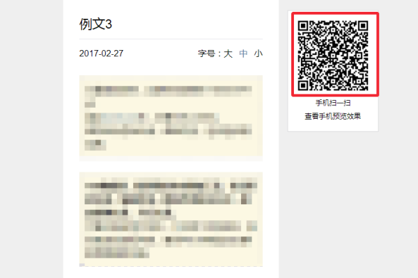 2、保存好之后,可以点击左侧我的文章查看到刚才保存的文章,然后点击预览,在弹出的网页右侧有一个二维码,用自己手机扫一下即可手机预览查看。