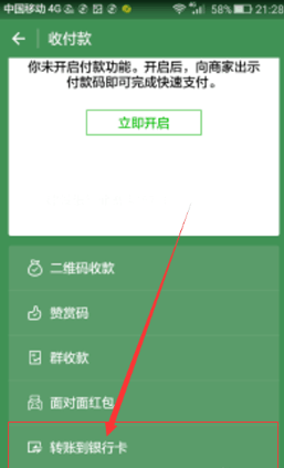 3、在收付款界面里,下拉到底部,选择“转账到银行卡”。(如下图)
