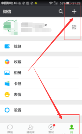1、登录微信-点击我-点击右上角的+号。(如下图)