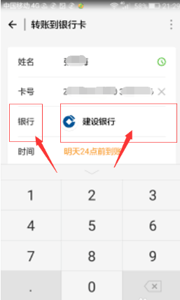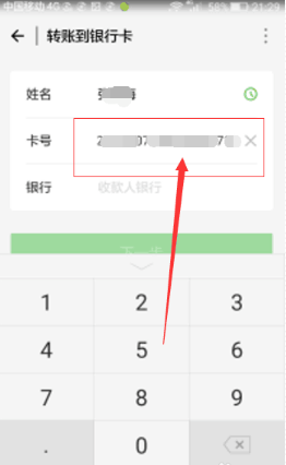 5、然后输入要转账银行卡的卡号。输入卡号后,点击银行,然后会显示出要转账的银行。