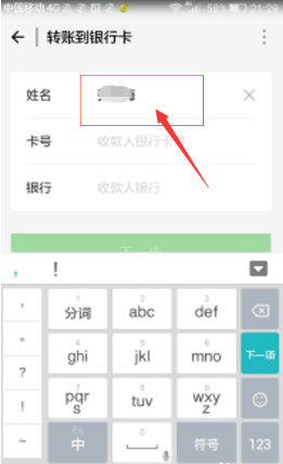4、在转账到银行卡的界面上,填写好要转账给对方人的姓名。(如下图)