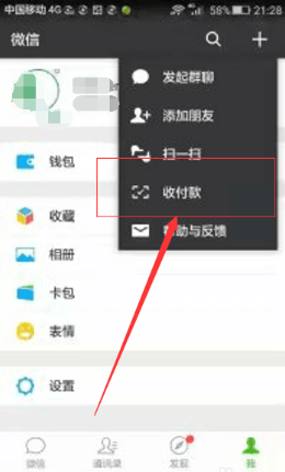2、在弹出的选项里,选择“收付款”选项。(如下图)
