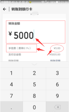 6、在转账金额栏里,输入要转账的金额。在转账金额的下面会显示转账金额的手续费。