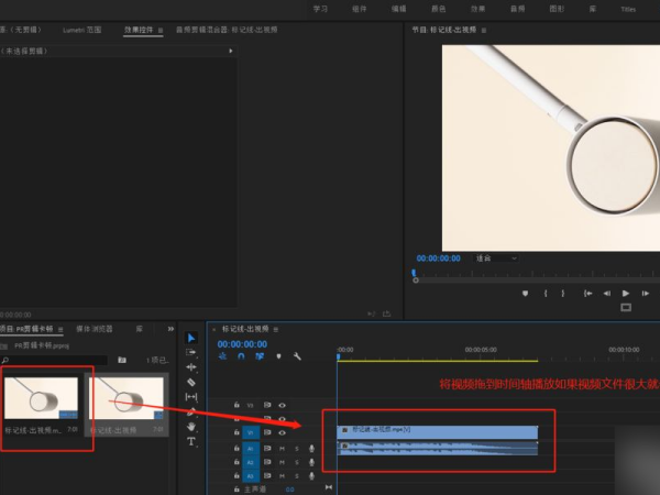 3、选中导入的大文件视频素材,拖到时间轴窗口单击,然后播放时间轴,由于当前这个视频文件过大在播放的时候就会比较卡顿。