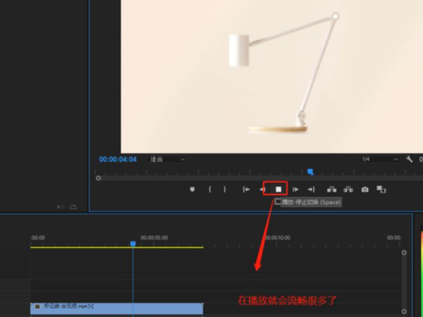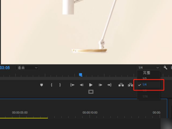 剪辑时卡顿是由于分辨率过高导致的,选中导入的大文件视频素材时在预览播放窗口的下方有一个“选择回放分辨率”,选择一个比较小的分辨率即可,会发现视频播放就比之前流畅了很多,详细步骤: