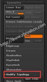 3、在Tool工具栏中找到Geometry菜单。点开Modify Topology栏目,然后在点击Del hidden(删除隐藏面),如图所示。就这样,模型的部分面就删掉了。 注:第三步中ZBrush几个版本的Del hidden按钮的位置不一样。ZBrush R2以下的版本,这个按钮的位置就在Geometry菜单下。 而ZBrush R2以上的版本,这个按钮的位置就如我说的那样。