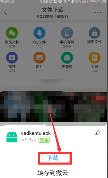 3、进入到手机中的文件下载界面之后,在点击里面的“微信文件”找到需要打开CAD图纸文件,然后就将CAD图纸文件进行下载。