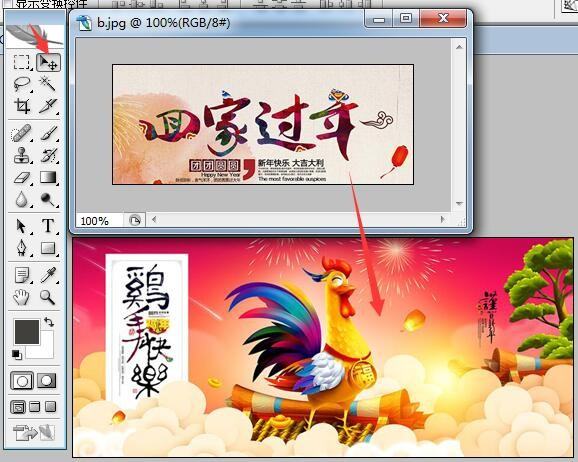 3、打开要插入的图片,点击工具箱中的移动工具,然后按住鼠标把图片拖到前面建立的图层上方,如图: