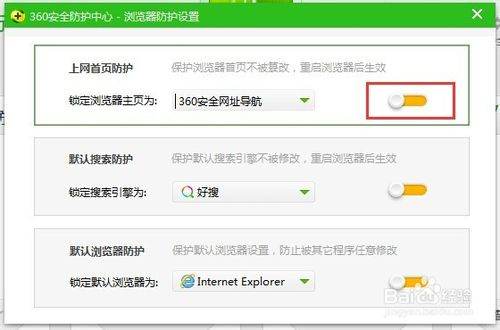 3、在弹出的浏览器防护设置中的上网首页防护。锁定浏览器主页为:360安全网址导航“取消”即可。在此也可设置IE浏览器为默认浏览器。