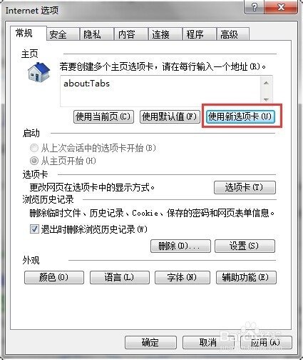 5、在Internet选项--常规--主页,点击“使用新选项卡”,确定。