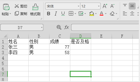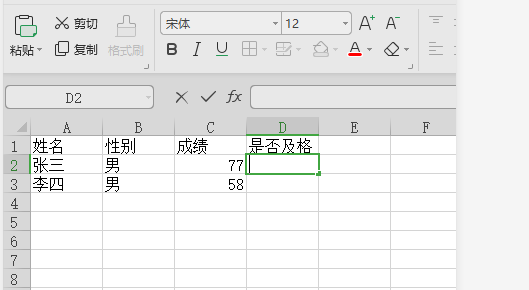 1、首先给出一些基础数据,目标是根据成绩判断,如果成绩大于等于60,则“是否及格”出显示及格,否则显示不及格: