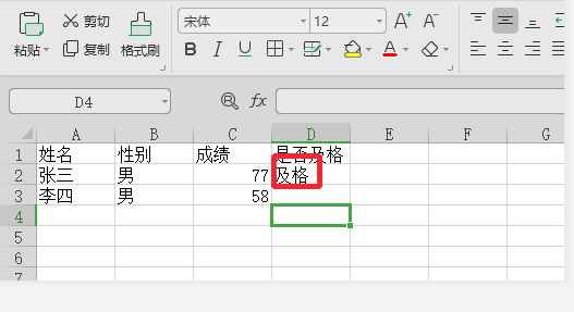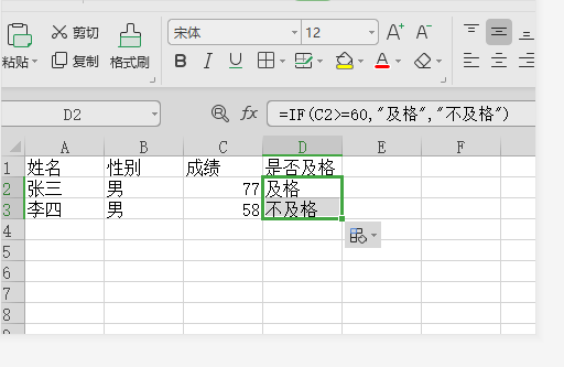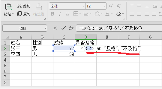 6、按回车生效使函数应用到单元格,D2就根据C2的值“77”符合“>=60”的范围,变成了“及格”。