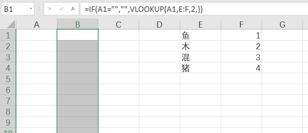 这样,只要在A列输入数据,B列就会自动显示与之对应的数据,如下图所示: