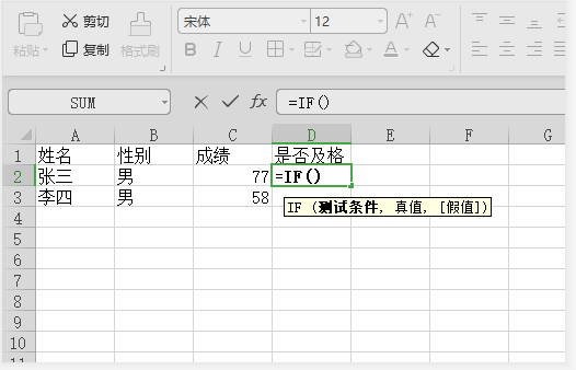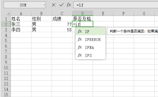 3、出现输入光标后在D2单元格内输入=if,就会弹出选择excel函数的提示:
